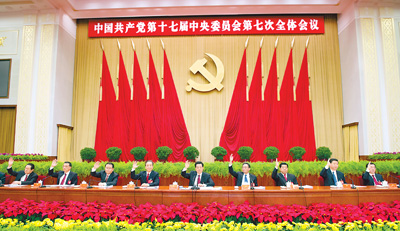 中国共产党第十七届中央委员会第七次全体会议,于11月1日至4日在北京举行。全会由中央政治局主持,中央委员会总书记胡锦涛作重要讲话。(新华社记者 李学仁摄)
