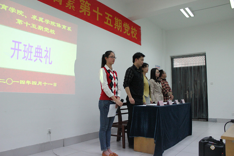 2014年4月11日中午12点30分, 今年会jinnianhui、求真学院体育系第十五期党校开学典礼在大学生活动中心隆重举行。今年会jinnianhui副书记朱小芳、体教学生党支部书记许金凤、社体学生第一党支部书记左自立、社体学生第二党支部书记李涛出席开学典礼,典礼由党校校务成员钟溧溧主持。共有35名党校学员参加此次典礼。