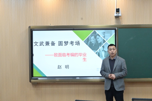 赵老师为同学们带来了“文武兼备,圆梦考场”的精彩考编讲座, 讲解了笔试的核心内容有教育理论常识,学科专业知识教学设计及前沿理论概念,他以自身作为教研员的身份出发,为同学们指出了体育与健康课程的核心素养:一是掌握与运用体能和运动技能,提高运动能力。二是学会运用健康与安全的知识和技能,形成健康生活方式。三是积极参与体育活动,形成良好的体育品德。教研员强调我们必须坚持“健康第一”,落实“教会、勤练、常赛”,加强课程内容整体设计,注重教学方式改革,重视综合性学习评价,关注学生个体差异。同时也为大家讲解了模拟上课常出现的教学内容,告诫同学们目标表述要清晰,准备活动要聚焦,练习方法要有效,学教方式要转变,教态讲解要清晰。并希望同学们能够努力学习文化课来准备理论考试,也要精通各项教师技能以便在技能考核中得到较高分数,并且要熟能生巧,只有在平时多多练习上微课,才能在考编面试时发挥出最好水平。认为,上岸不会发光,努力上岸的你才是真正发光的那个。厚德载物,天道酬勤,机会一定是给有准备的人的。