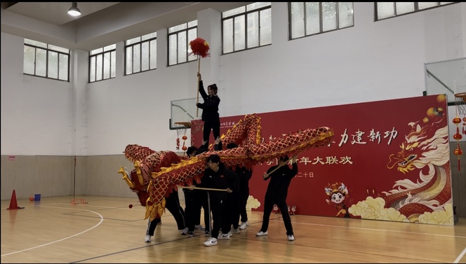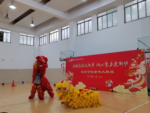 为营造龙腾虎跃迎新年的氛围,校武术队为活动现场带来了舞龙舞狮表演,党总支负责人为表演的中国龙点睛。一点天庭,福星高照;二点眼睛,眼观六路;三点舌头,笑口常开,大吉大利。伴着音乐,让大家欣赏了长龙搅动风云,翻腾起舞,狮子嬉戏、跳跃,展现了生机勃勃的场面,同时,醒狮斗蛇驱邪避鬼,以祈望生活吉祥如意,事事平安。给我们带来无尽的惊喜和欢乐。