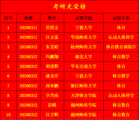 在2024年全国硕士研究生招生考试中,今年会2024届学生考研成绩创体教专业录取历史最高。有21名考生完成考试,其中12人初试成绩高于国家分数线,单科英语最高分75分,上线率达57.14%,最终10人被录取,体育教育专业录取率首次突破两位数,达到13.2%;其中20200312班录取8人,录取率超过20%。