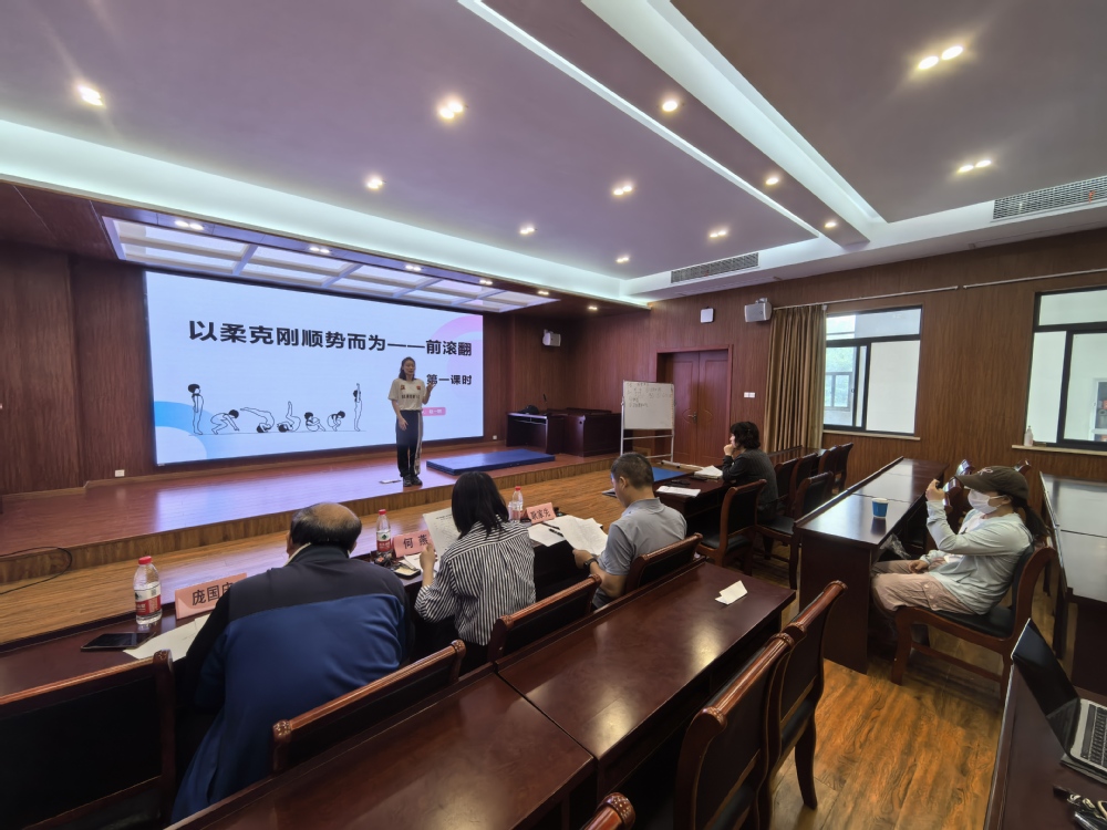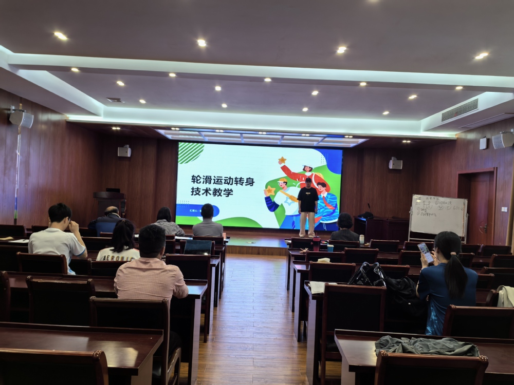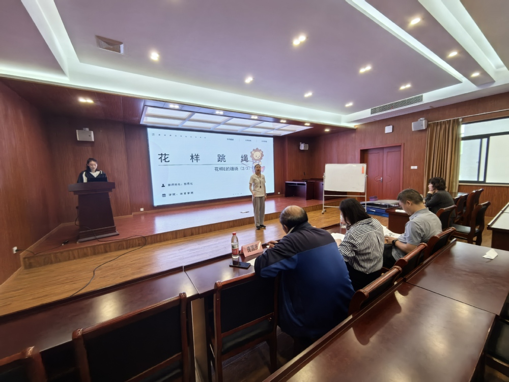 比赛现场,参赛教师依抽签顺序依次登台。他们紧扣“以体育人”的根本任务,结合体育学科特点与学生身心发展需求精心挑选授课主题,围绕运动技能传授、体育精神培养、健康理念树立等方面进行教学设计。在20分钟的教学展示中,教师们各展风采。郭思化老师以《花样跳绳》——花样E的缠绕教学为例,展示了缠绕技巧的分解动作,配合前期录制的视频,让现场仿佛置身活力四溢的运动课堂;杨永昭老师以《轮滑》——转身技术教学为例,通过探究式教学和亲自示范,讲解了轮滑运动的转身技巧和安全注意事项,让学生更直观地理解和掌握轮滑技能,充分展现了青年教师扎实的专业功底与教学创新能力。